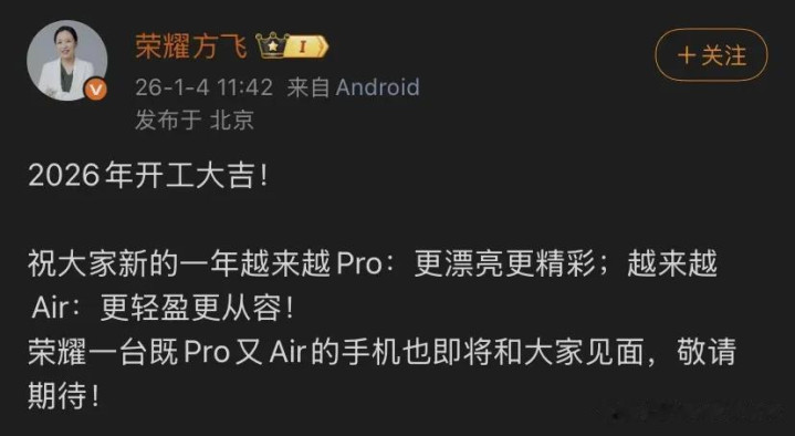 是的,这款全新超薄荣耀手机可能被命名为——Magic 8 Pro Air。荣耀官方已暗示了这一名称,并透露了一些关键细节。荣耀产品线总裁方飞在向所有荣耀粉丝和消费者送上新年祝福时,提到了一款神秘的“Pro + Air”手机!她表示:“祝大家新的一年越来越Pro:更漂亮更精彩;越来越Air:更轻盈更从容!”