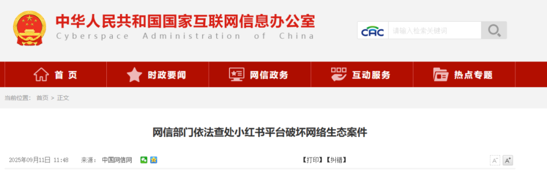 网信部门依法查处小红书平台破坏网络生态案件